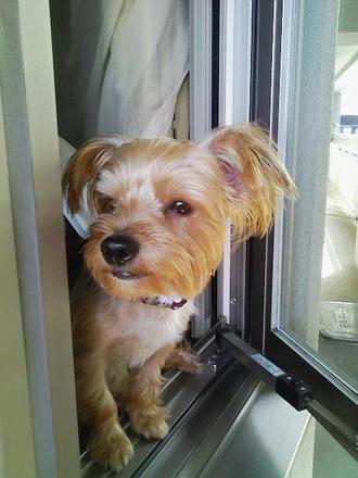 ベランダにベンチを出して涼んでいると、みかんが窓から体を乗り出して来ました。