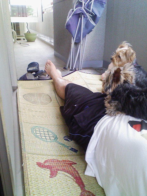 キョロは、おらの腹の上で昼寝です。